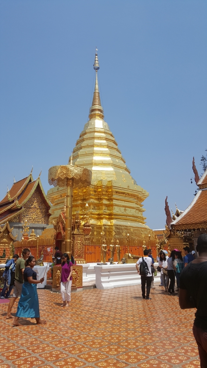 En aan het verschil in aantal toeristen te zien, zou deze tempel wel iets spectaculairder zijn. Na een enorme trap waar maar geen einde aan leek te komen, werden we deze keer niet teleurgesteld. Tussen de massa toeristen door, was een enorme gouden tempel te zien met er rond verschillende altaars. Aangezien deze tempel helemaal bovenop een bergtop gelegen is, hadden we ook een spectaculair uitzicht over de hele stad. Hier volgen weer enkele foto’s: