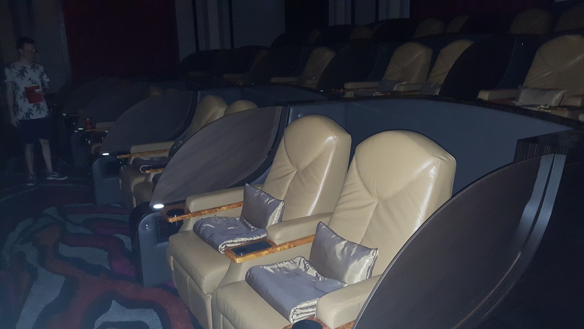Anderhalf uur en een relatief pijnlijke val later, zijn we naar de filmzaal gegaan. Wat ik nog niet vertelde, is dat we bij het bestellen van de tickets eens voor de duurste optie gegaan zijn, we waren tenslotte maar 1 keer hier en de prijzen van het duurste ticket hier komen overeen met een normaal ticket in België. Ik hoop dat ik na deze ervaring ooit nog van een ‘normaal’ cinemabezoek zal kunnen genieten… In de zaal waren slechts een stuk of 20 paar stoelen, waarbij op elke stoel een kopkussen en dekentje voorzien was. Alsof dat nog niet luxueus genoeg was, waren de stoelen ook nog eens elektrisch verstelbaar en kon je bijna volledig plat liggen. Natuurlijk wou ik alle knopjes eens uittesten, en door het donker niet goed wetend op wat ik allemaal gedrukt had was ik verrast toen er een vriendelijke heer kwam vragen of ik nog iets gewenst had bij de film. Oeps!