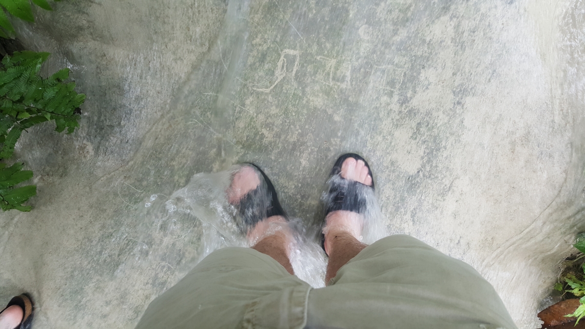 Onderaan de waterval aangekomen, had men niet gelogen. Je kon op de stenen wandelen, alsof ze ingewikkeld waren in schuurpapier. Dit was best een eigenaardig gevoel, maar het koele water dat rond je voeten stroomde deed wel deugd bij deze temperaturen. En dan klimmen maar! Hieronder een kleine fotoreportage: